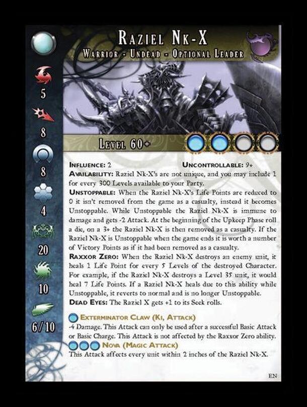 The ultimate killing machine, the most powerful necromantic weapon ever created… After a decade of investigation and iteration, the researchers at Black Sun have been able to develop the Raziel Nk-X, the zenith of all their experiments. With unequaled skills and powers, nothing in the world is able to face this fearsome new model of undead knight. Neutral...