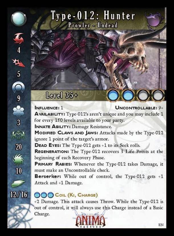 The Hunters are powerful, beastly, necromantic weapons made by Black Sun. They are a deadly combination of strength, brutality, and supernatural speed. Neutral Black Sun Prowler Undead - Lv. 35+ Att 4 | Dam 5 | Def 9 | Arm 3 | LP: 20 | Res 10 | Mov 12/16 | AP 2/4 Availability: Type-012s aren’t unique and you may include 1 for every 150 levels available to...