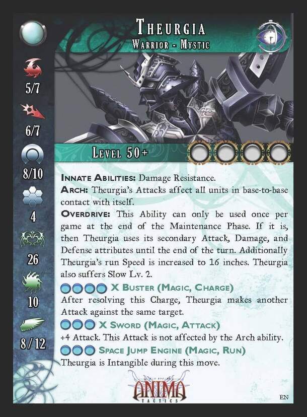 Neutral Wissenschaft Warrior/Mystic — Lv. 50+ At 5/7 | Dm 6/7 | Df 8/10 | Ar 4 | LP 26 | Re 10 | Mo 8/12 | AP Varies/4 Innate Abilities: Damage Resistance. Arch: Theurgia's Attacks affects all units in base-to-base contact with itself. Overdrive: This Ability can only be used once per game at the end of the Maintenance Phase. If it is, then Theurgia uses...