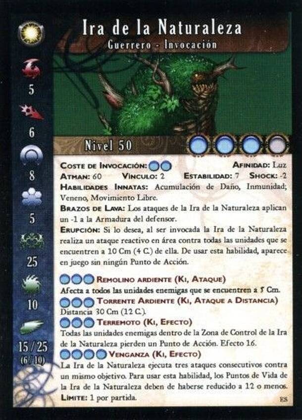 Light Summon Warrior Level 35 version At 4 | Dm 6 | Df 8 | Ar 4 | LP: 25 | Re 10 | Mo 6/10 | AP 2/4 Cost to Summon: oo | Affinity: Light Atman: 60 | Bind: 2 | Stability: 8 | Shock: -2 Innate Abilities: Damage Resistance, Immunity (Poison), Open Movement. Lava Arms: All of Nature's Wrath's attacks ignore one point of the opponent's armor. Eruption: When the...