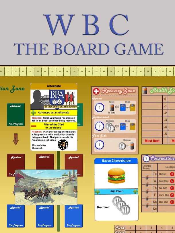 WBC-The Board Game is a game for 3-5 players, who will share the fun of the week-long World Boardgaming Championships, contesting convention events in a quest for Laurels and competing for the ultimate prize: The title of Caesar. Players must manage their time wisely. They must remember to carve out a moment between games to sleep and eat while dodging...