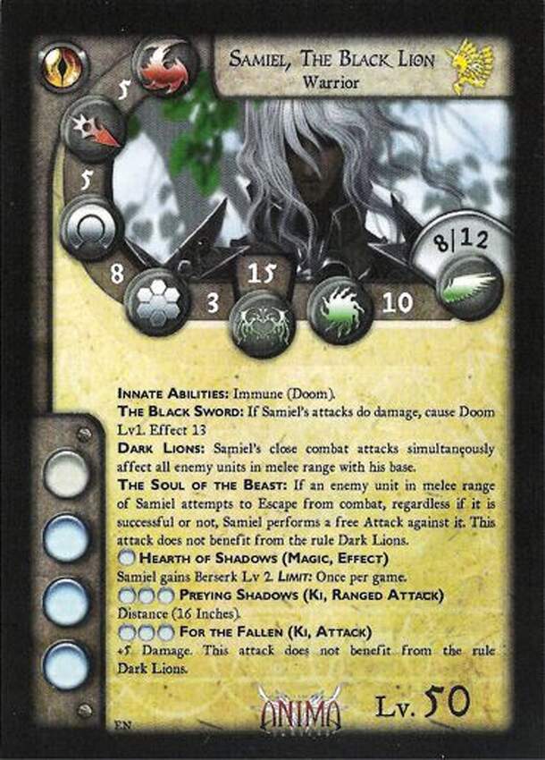 The Black Lion of Abel is the darkest agent of Elisabetta Barbados. Feeding from death itself and commanding a legion of ghostly beasts, he is a tortured soul torn between his dark destiny that forces him to kill to survive and his own guilt. Dark Empire Warrior - Lv. 50 At 5 | Dm 5 | Df 8 | Ar 3 | LP 15 | Re 10 | Mo 8/12 | AP 3/4 Innate Abilities: Immune...