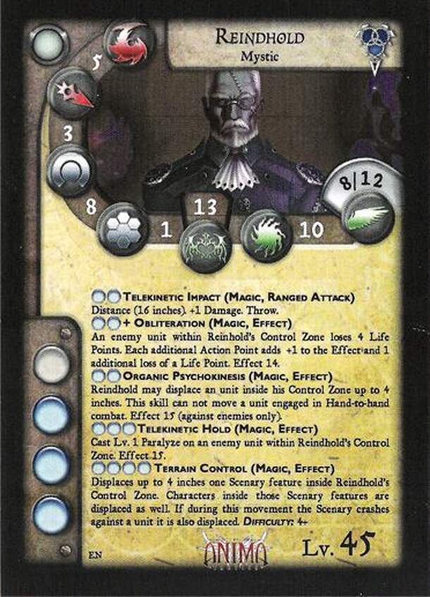 Lord Alfred Reinhold, descendant of one of the oldest and most influential noble houses of Togarini, is one of the most important members of Les Jaeger. Gifted with powerful psychic powers, this old man is able to move mountains with the power of his mind. Neutral Azur Alliance Mystic - Lv. 45 At 5 | Dm 3 | Df 8 | Ar 1 | LP: 13 | Re 10 | Mo 8/12 | AP 3/4...
