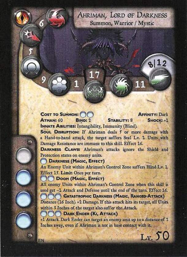 The Ahriman are the dark twins of the maidens of light. The most powerful known dark elementals. With their unique powers, they are virtually unstoppable. The lords of Darkness have once again set their sites on Gaia. Dark Summon Warrior/Mystic Level 40 version At 5 | Dm 5 | Df 9 | Ar 1 | LP: 17 | Re 11 | Mo 8/12 | AP 3/4 Cost to Summon: oo | Affinity:...