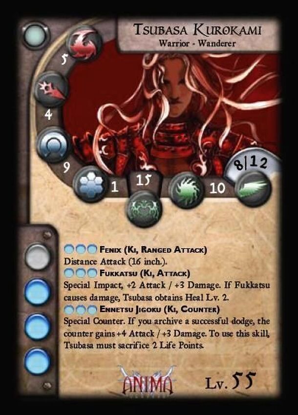 Samurai of the Kurokami house, after mastering the Houou combat style he has become one of the best warriors of his land. Now, Tsubasa travels around the world, finding worthy opponents to test his skills. Neutral Wanderer Warrior - Lv. 55 At 5 | Dm 4 | Df 9 | Ar 1 | LP: 15 | Re 10 | Mo 8/12 | AP 3/4 ooo - Fenix (Ki, Ranged Attack) Distance Attack (16...