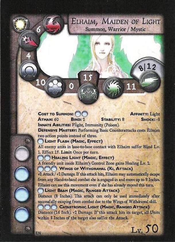 The Elhaim, or Maidens of Light, are luminous powers born of pure light before the war in heaven. Many believe them to be angels, whose powers will be essential to saving Gaia from the dark. Light Summon Warrior/Mystic Level 40 version At 6 | Dm 4 | Df 9 | Ar 0 | LP: 15 | Re 11 | Mo 8/12 | AP 3/4 Cost to Summon: oo | Affinity: Light Atman: 60 | Bind: 2 |...
