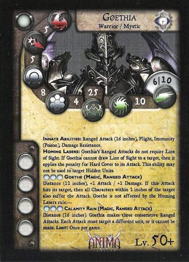 Goethia is the most modern of the Combat Gears developed by Wissenchaft. Using the science of the Lost Logias, this artifact of destruction is capable of devastating entire armies with its powerful technomagic weapons. Neutral Wissenschaft Warrior/Mystic- Lv. 50+ At 5 | Dm 5 | Df 8 | Ar 4 | LP 25 | Re 10 | Mo 6/10 | AP Varies/4 Innate Abilities: Ranged...