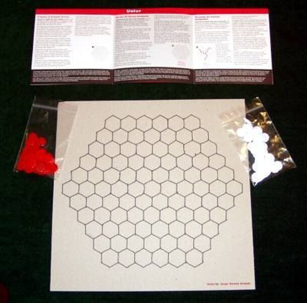 Unlur, the winner of the 2002 Unequal Forces Game Design Competition (sponsored by About Board Games, Abstract Games Magazine, and the Strategy Gaming Society), is an abstract strategy game played on a hexagon-shaped tessellation of hexagons with eight hexagons on each side. Unlur is also a game of unequal forces -- each player has a different objective....