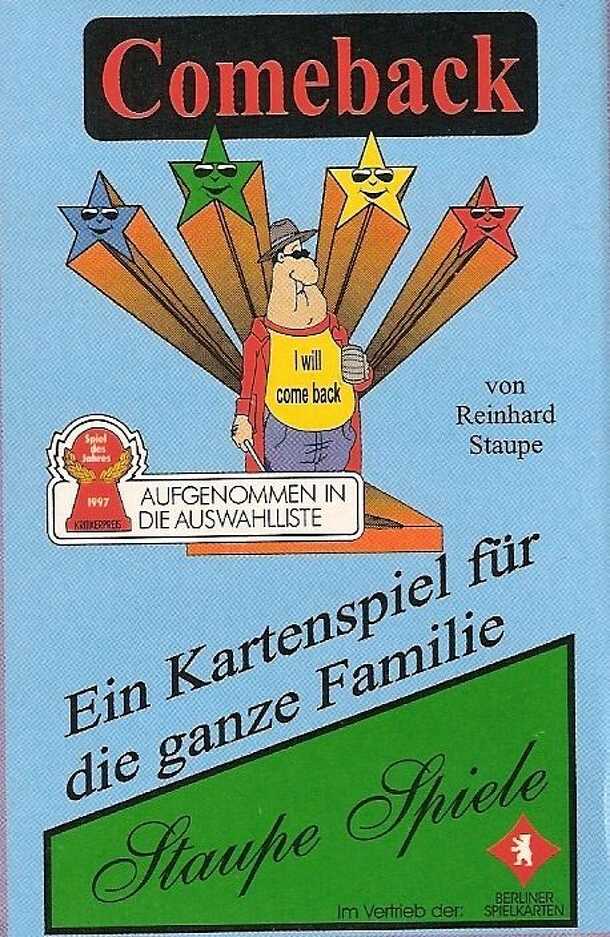 Another in the line of very small card games by Reinhard Staupe. The deck consists of four suits of cards numbered 1 to 7. The 1s have three stars, the 2s have two stars and all other cards have one star. Players start with 150 points (which serves as a starting score and a money pool for bidding). For 2 players, use 16 cards, for 3 players use 21 cards...