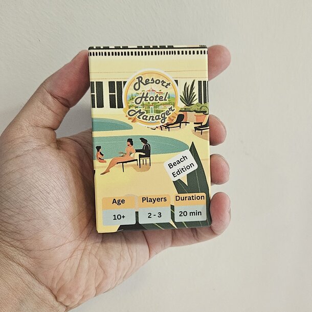 Resort Hotel Manager is a competitive bidding / auction game with a hotel theme. Players act as resort hotel operators who bid to win guest booking requests, balancing budget, room class, and flexibility demands. Each round, a request card is revealed showing a guest’s budget, minimum hotel rating, and optionally flexibility requirements. Players may (a)...