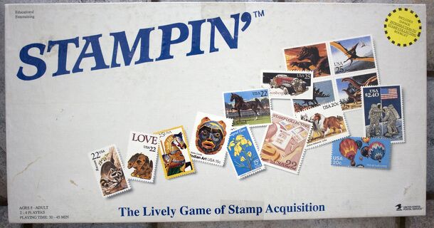 Stampin' is a game approved by the U.S. Postal Service. The object is to collect sets of four stamps. You'll need to "wheel and deal" to get the cards you need. And, you'll need to manage your cash flow so that you can buy stamps, as well as win auctions along the way. The game comes with a book about stamp collecting, and has many pictures of actual...