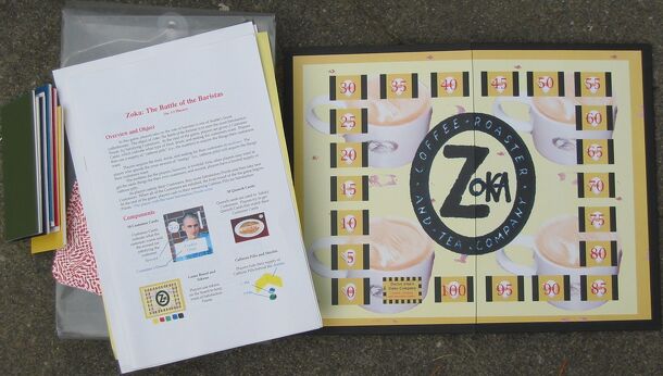 From the back of the box: As a Barista in one of Seattle's finest coffeehouses, you strive to earn the respect and praise of the regular customers. The object of Zoka: The Battle of the Baristas is to become the most popular Zoka Barista by providing the highest level of customer satisfaction. This goal is accomplished by "satisfying the customers," i.e....