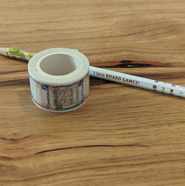 Milestone is a game consisting of a roll of washi tape and a special "dicil", a pencil with printings on the sides such that it can be used as a die. In the game, players pull out two lengths of tape, and place the, parallel to each other on the playing surface, with a fist's width between them. On your turn, roll the pencil towards the lengths of tape....