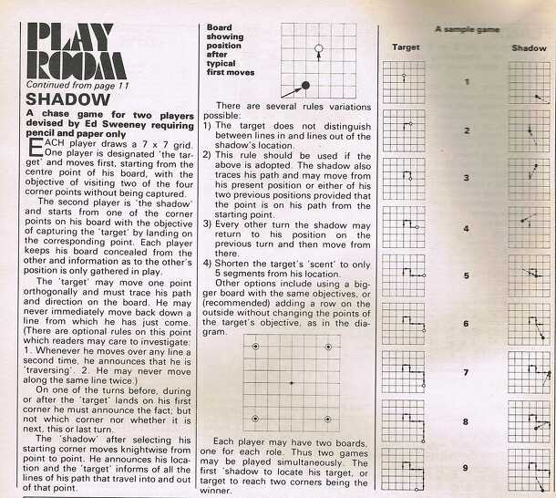 Logical deduction game. Each player starts with a grid of 7 x 7 squares. Both boards must be hidden from the opponent. One player (the Target) marks his starting point in the centre square of the grid. The other player (the Shadow) starts at any one of the four corner squares. The objective for the Target is to visit two of the four corner squares without...