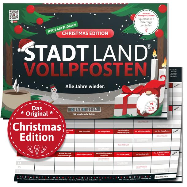 festive edition of the cult game STADT LAND VOLLPFOSTEN on the theme of Christmas CULTIGE GIFT IDEAS - This Stadt-Land-VOLLPFOSTEN block is sure to make you smile when you give it as a gift and is an ideal, funny gift idea for Christmas. After all, everyone knows Stadt-Land-Fluss and who would have thought that this well-known classic game could be...