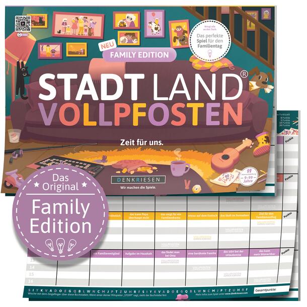 The heart-warming edition of the cult game STADT LAND VOLLPFOSTEN. The ultimate game pad featuring 26 creative and fun categories for hours of fun with children, parents, and grandparents. Each player is given one page of the A4 pad and places it in front of them. A time limit is set for each round (we recommend 2 minutes). The innovative letter strip...