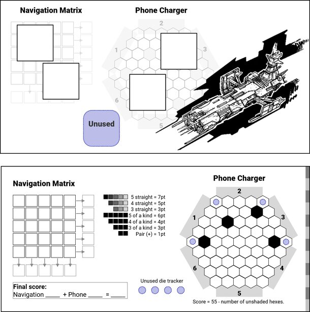 Emergency sirens blare throughout the starship and you race to the escape pods. Take a moment to fully activate the escape systems and you stand a much better chance of survival. Of course, the Navigation Matrix is vital, but so is the USB Phone Charger — you wouldn’t want to be floating in space without access to your games! In this roll and write game...