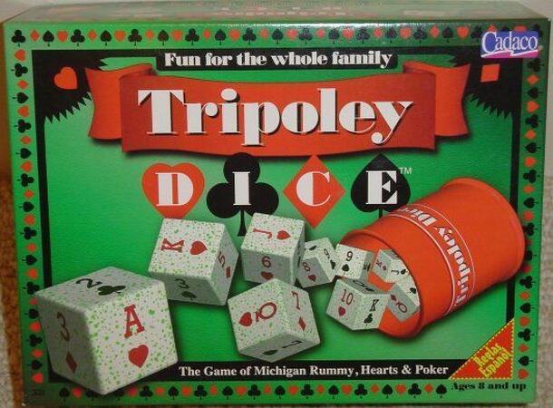 Tripoley Dice is described on the front cover of the rulebook as a game for two or more, ages 8 and up. The game comes with 9 special dice, 1 dice cup, rules, and 1 pad of scoring sheets. The object is to win the most total points in each game, or series of games. A game of Tripoley Dice consists of three known games, or sections: Hearts, Poker, and...