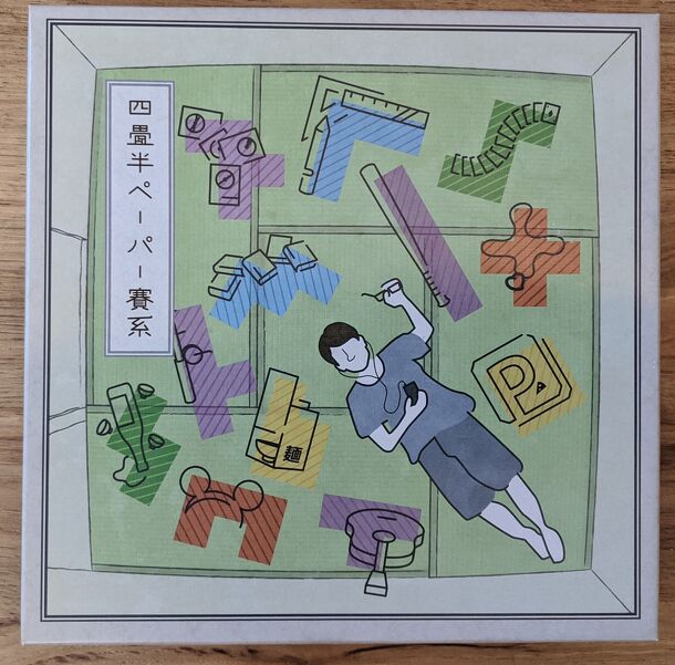 In 四畳半ペーパー賽系 (Yojōhan Pēpā Saikei), roughly "Four and a half tatami mat room", players are experiencing their last 12 months of school life and trying to balance their school work, hobbies, friends, love life, and a part time job. A deck of polyomino cards and a roll of 5 dice determine what shapes the players may color in on their mats each turn. The...