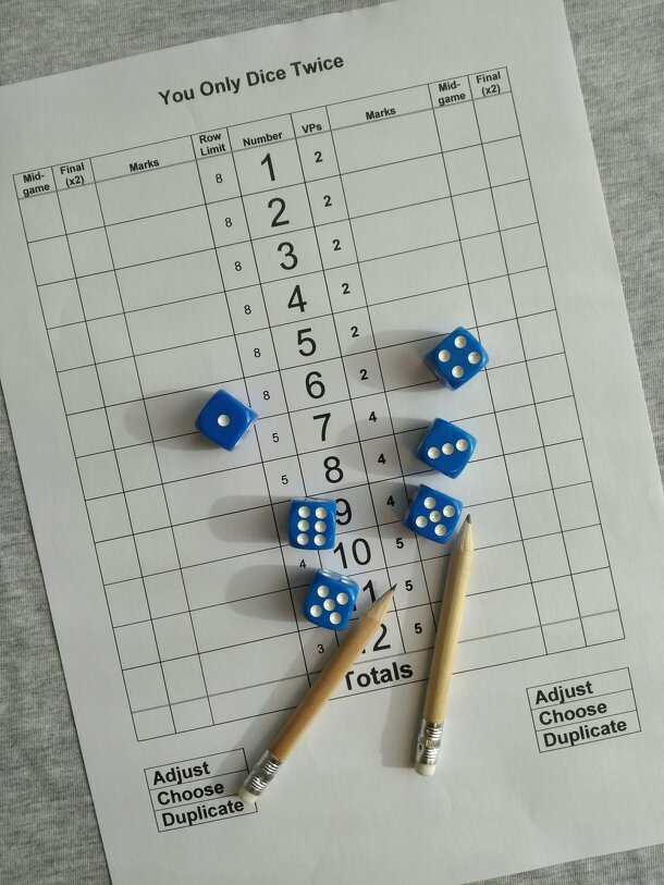 You Only Dice Twice was created for a two-player dice game design competition. The hardest thing to include in most dice games is some kind of player interaction, so that was a major design goal. Players race to be the first to close out the most and most valuable number categories. Each turn, you roll six dice, but you can only use three of them for...