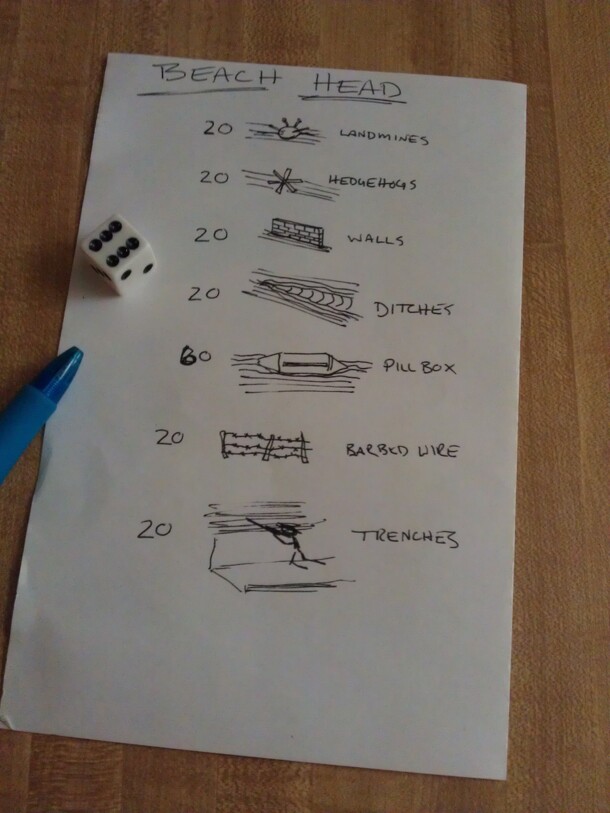 “Solo dice game simulating the actions on a small section of the Normandy Beach landings in WWII. Objective: The game ends when the Allies remove all German Bunkers and Trenches. Removed may mean ‘cleared of troops’ in the case of Bunkers and trenches or ‘Punching through gaps’ for Traps, wire, walls, mine-fields, & ditches. Scoring: Keep track of Allied...