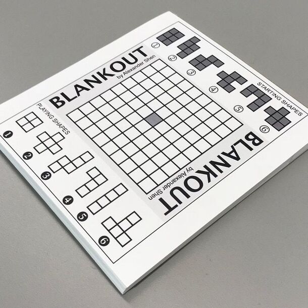 Blankout is a roll-and-write game where players compete to fill up a grid with tetromino shapes. Last person to able to fit a tetromino into their grid is the winner! A d6 always determines which shape a player will use. At the start of the game, a player will use one of the "Starting Shapes." The only rule here is one of the squares must overlap the...