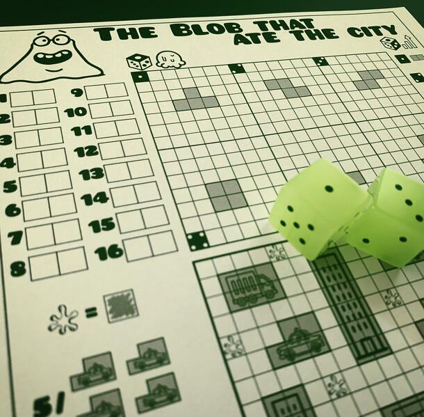 You are a blob. Eat the city. Grow big. Earn the most points. Each Round you will roll 2 dice and then use one those dice to draw a shape in the city and then use the other die to grow the shape that you used in the city. You eat/devour a city shape when you completely cover each square of its shape. Each polyomino placed in your city is never the same, as...