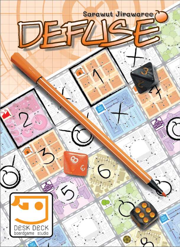 DEFUSE is a puzzle roll-and-write game. The players try to defuse the bomb by draw the bomb equal the number it around for get points. Whoever do their best and get the most point in ten rounds win the game. The game is played over ten rounds. Each round has two phases: DETECT Phase and DEFUSE Phase. DETECT Phase: One player rolls all 4 dice (2:D8 and...