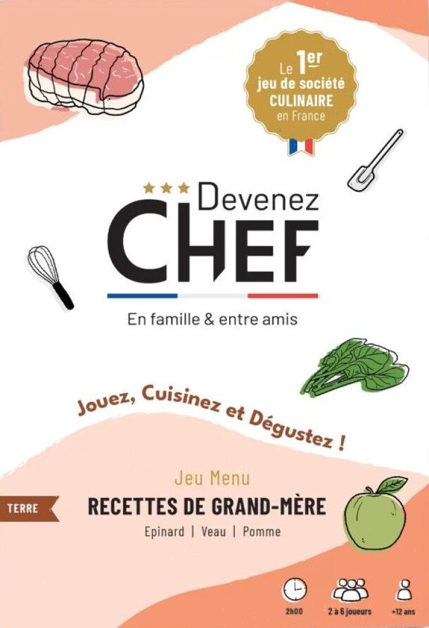 Cook with family or friends a mystery menu to discover throughout the game. At the end of the game, taste your chef's achievement: a complete menu (starter, main course, dessert) Difficulty level: 3 out of 3 – Grand chef level Main ingredients: spinach, veal, apple Other ingredients: mushrooms, rice, carrots, celery, old-fashioned mustard, crème fraiche...