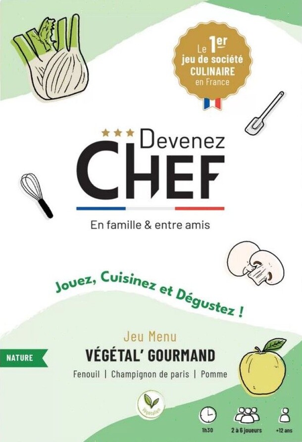Cook with family or friends a mystery menu to discover throughout the game. At the end of the game, taste your chef's achievement: a 100% vegan menu (starter, main course, dessert) Difficulty level: 2 out of 3 – Daily chef level Main ingredients: fennel, button mushrooms, apple Other ingredients: passion fruit, lemon, oranges, vegetable milk, ground...