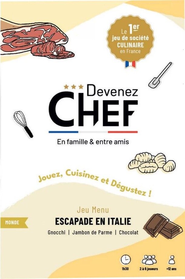 Cook with family or friends a mystery menu to discover throughout the game. At the end of the game, taste your chef's achievement: an Italian menu (starter, main course, dessert) Difficulty level: 2 out of 3 – Daily chef level Main ingredients: gnocchi, Parma ham, chocolate Other ingredients: veal cutlets, mozzarella di bufala, parmesan, almonds, lemon...