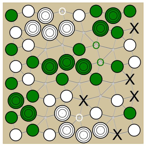 Plurality is a finite territorial game. The game is played on a 13x13 or 19x19 board, like Go. The concept of territory exist disconnected from concepts like groups or liberty. Territories' ownership depend on the most represented color in their perimeters. On their turn, players drop two friendly stones and one adversary stone as a single orthogonally...