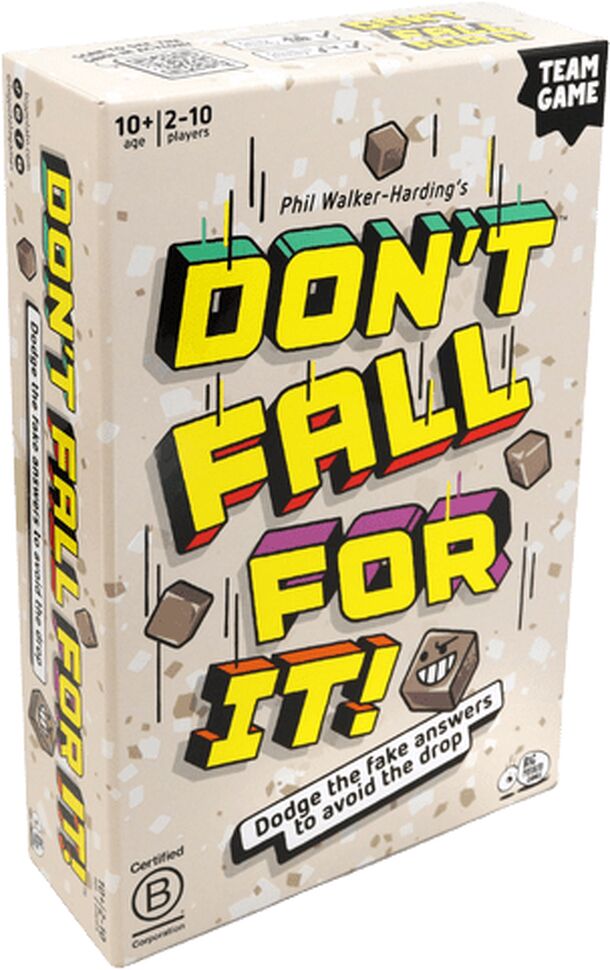 Don’t the fall for the fake answers to avoid the drop! Players form into two teams and take turns guessing which 5 of 11 items on a list are actual examples of a category on the card (e.g., Bears, Best Picture Oscar Winners, McDonald’s Menu Items). They pull a tab that keeps the answers hidden. If they guess right, the other team takes a turn. If they get...