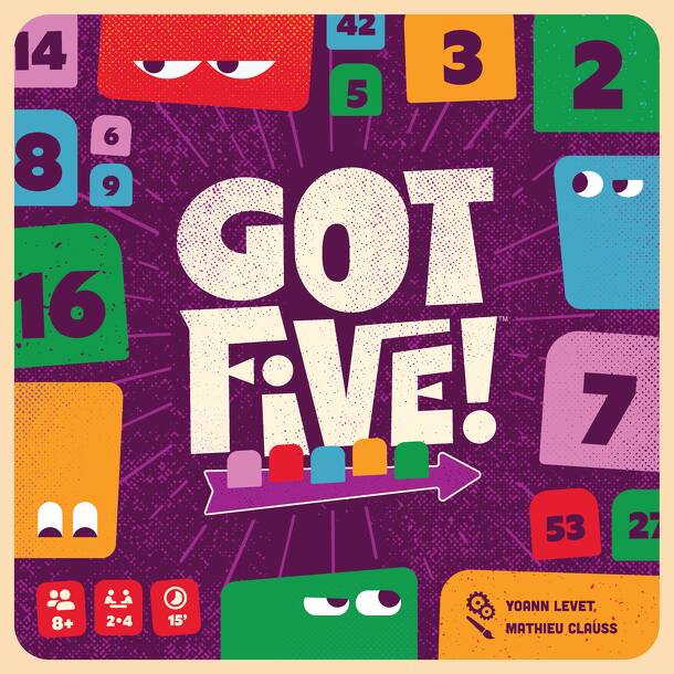 Five numbers have their backs to you. Use your logic to guess their values! Pick a number Ask your opponents for a clue Make the right deductions Think you know your 5 numbers? Call out ‘GOT FIVE! Got Five! is a game of logic and deduction where players must guess numbers on a set of 5 tiles placed on their stand. Each clue you ask for throughout the game...