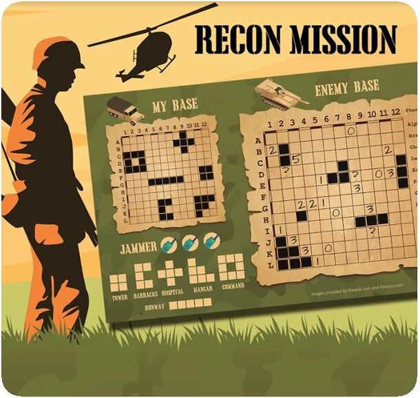 In this 2-player "search and write" game, you are a soldier conducting reconnaissance to map out your enemy's base. Gather intel one square at a time and use logic to complete the map before your enemy does. Power up your jammer at the right times to slow them down! Recon Mission's gameplay is a cross between Battleship and Minesweeper, with a defensive...