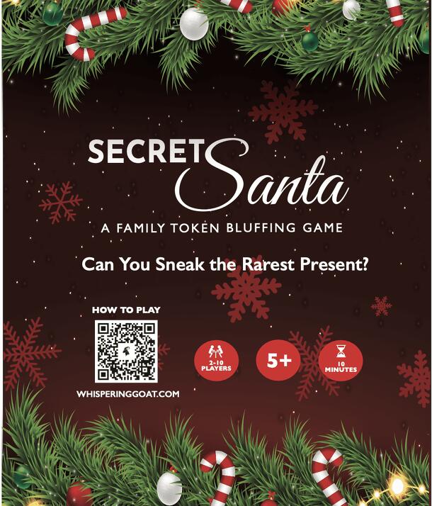 Secret Santa is a family token bluffing game. The tokens are reminiscent of POGS. Each token has the same back: wrapping paper. The other side is one of the 78 gifts from the 12 days of Christmas: 12 drummers, 1 partridge, and everything in between. On your turn you will either take an unopened present from the middle, or steal one of your opponents' three...