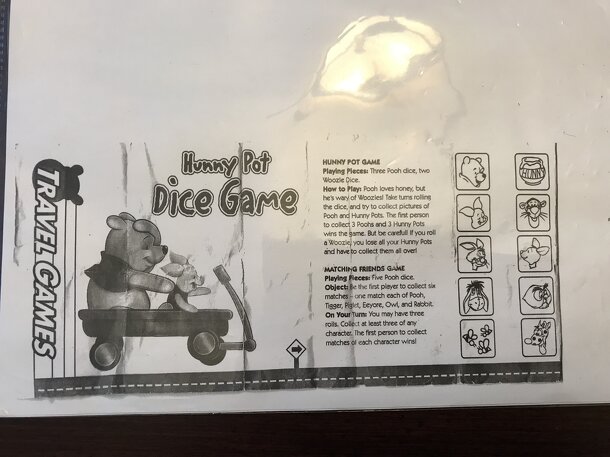 Roll the dice to find matches of all Pooh's friends! Be on the lookout for honey and bees but beware of Woozles! This portable game, originally produced exclusively for the Walt Disney theme parks, offers players three different games. Hunny Pot Dice Game includes 7 dice, instructions detailing three different dice games and 'Tally' sheets, all of which...