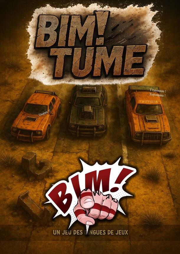 Bim!tume is a game, designed for 2 to 4 players, set in a post-apocalyptic world where everything is settled... with bumper shots! Each player takes the wheel of a tuned and heavily armored car. The goal: to be the last survivor on the mythical Road 2913. To achieve this, you'll have to skillfully maneuver between asphalt, sand, and murky water patches to...