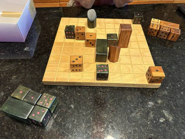 A blown up version of fantasy chess. Each player moves and attacks with one creature each turn. Each creature has their own unique stats (health points (HP), movement, and attack) that they use to deal damage to the opponent's creatures. When a creature receives damage, that creature will turn down to the face with the appropriate HP showing. Once a die is...