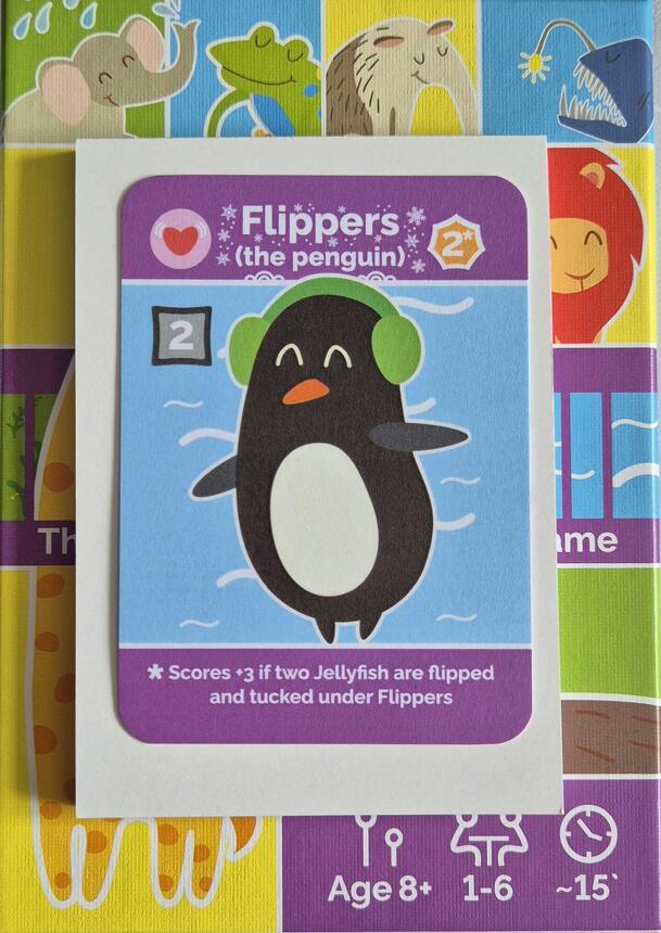 First available from the publisher at UK Games Expo 2025. Scores 2 points, plus an additional 3 points if two Jellyfish are turned face-down and tucked under Flippers. Flippers is available in three variants with blue, green or red headgear. The designer has confirmed that only one copy of Flippers should be added to the deck as this gives the best balance...