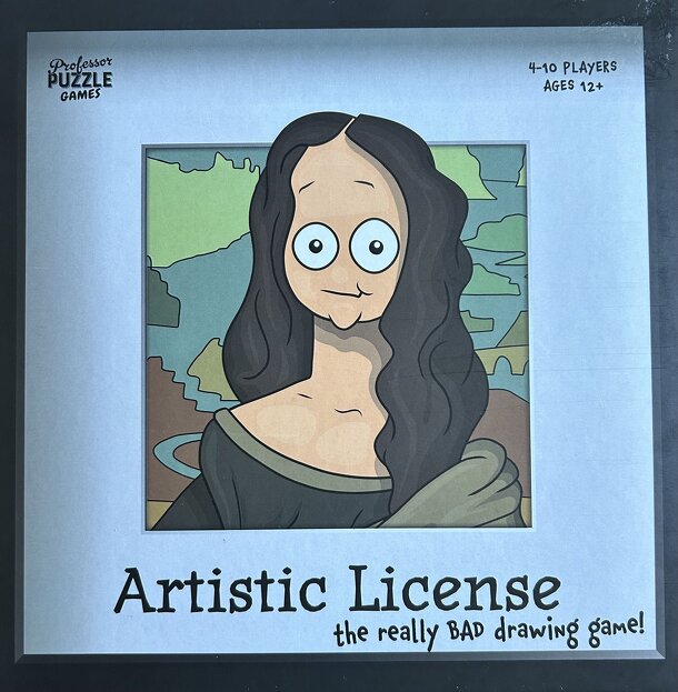 In Artistic License, two teams compete over three rounds to correctly guess the most drawings, like in Pictionary. The kicker is that as the rounds progress, the drawer's task becomes more difficult. In round two, the drawer must use their off-hand (ie, a right-handed player would draw with their left hand). In round three, the drawer must wear a mask that...