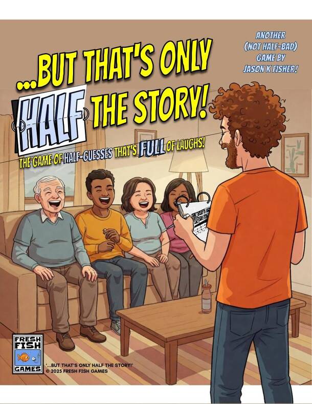 The Party Game of HALF-GUESSES that's FULL of LAUGHS! ...But That's Only HALF the Story! uses a mechanic seen in games like Eat Poop You Cat and Scrawl, as players have to try to guess what is happening based on pictures provided by previous players. The twist here is that you are together creating STORIES (not cohesive ones - frankly they're not going to...