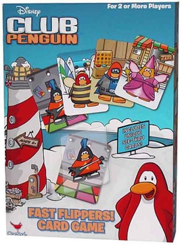 One of Club Penguin's first card games to play with your friends in real life. In this game you use Disney's Club Penguin characters and locations to find matches. 6 island cards are placed on the play surface face up and one see through penguin card is placed face up on each island. Each player takes a turn to flip a character card (which shows a penguin...