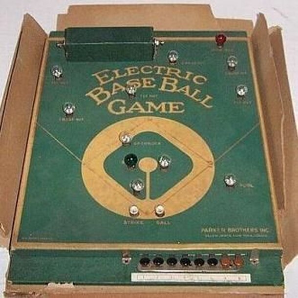 This is a very old, battery-operated electronic baseball game in which players try to outguess each other. The board depicts a baseball field dotted with lights that give the results of a play. The players use switches located at either end of the board for each pitch. For example, if the player batting presses the #2 button, and the player in the field...