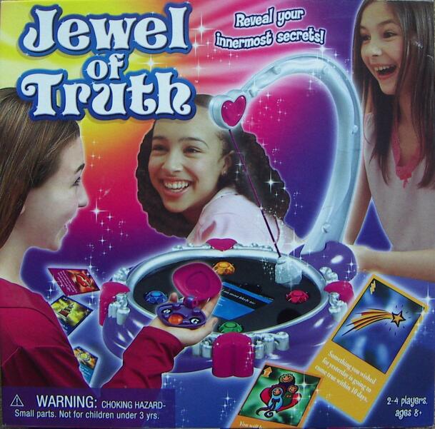 Jewel of Truth is a boardgame version of spin-the-bottle, designed for young girls. From the manufacturer: "Jewel of Truth will expose your innermost secrets and reveal your future! If the Jewel of Truth points to your colored jewel, you must reveal a secret, while other players try to guess what you will say. When players match your answer, you both earn...