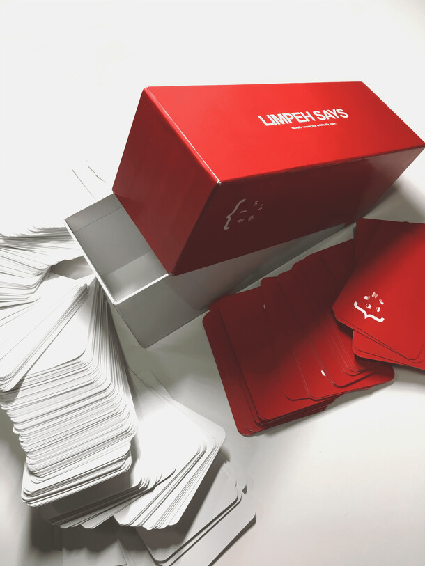 Description from the publisher: Limpeh Says is a card game for we the citizens of Singapore, containing 550 unique, localised cards revolving around the culture we've built here in our little country. Guided by the ideology of being 'morally wrong but politically right', it includes topics from food, to National Service, and everything else in between. The...
