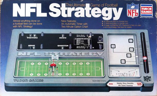 NFL Strategy is a football game based on plays and the ability to execute them rather than on team statistics. The number of offensive plays and defensive plays varies with each edition and one special teams card are included. Each player secretly chooses his play. The defensive play (which has clear "windows" on it)is played on top of the offensive play...