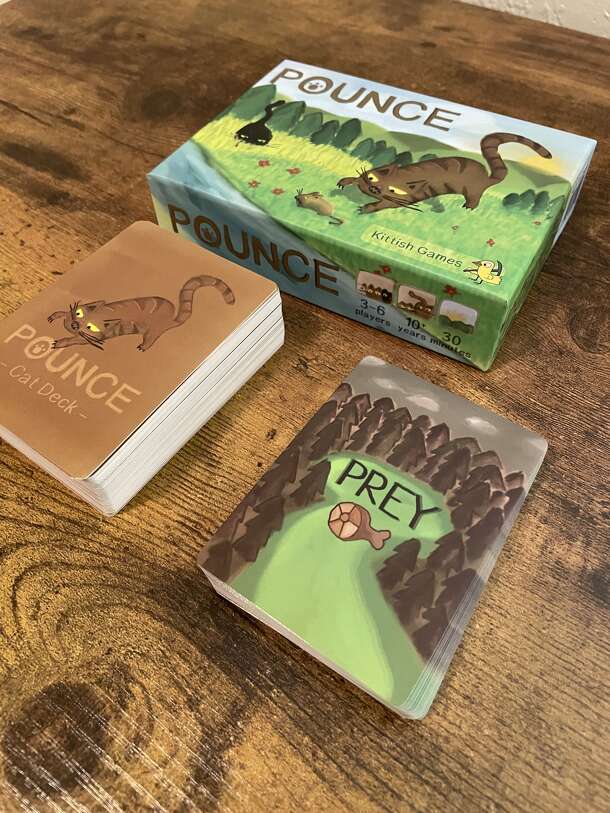 In Pounce, players become cats aiming to catch prey totaling 8 food value. Each round, a new prey is turned over and player simultaneously selects Sleep, Stalk, or Pounce. Players who Pounce must place their Pounce action card on one of the revealed prey. If only one player chooses it, they can catch it by discarding Energy cards from their hand. If...