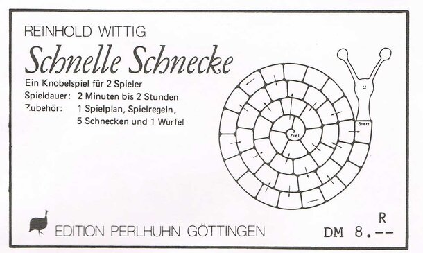 Schnelle Schnecke (Fast Snail) is a racing game game that is best described as a mathematician's Chutes and Ladders. The board shows a circular track as the body of a snail, and players start at the head and try to be the first to get their piece into the end space in the center, by way of 45 spaces. Some of the spaces have arrows that point to other...