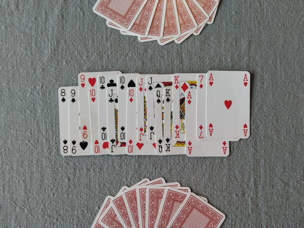 This game is played with 32 cards from a standard deck of cards, with cyclic ranking AKQJ10987. Both players are dealt 16 cards (therefore they know the cards of the other player). To decide who starts, both players select a card from their hand and reveal them simultaneously. If both cards are the same colour (red or black) then non-dealer starts; if...